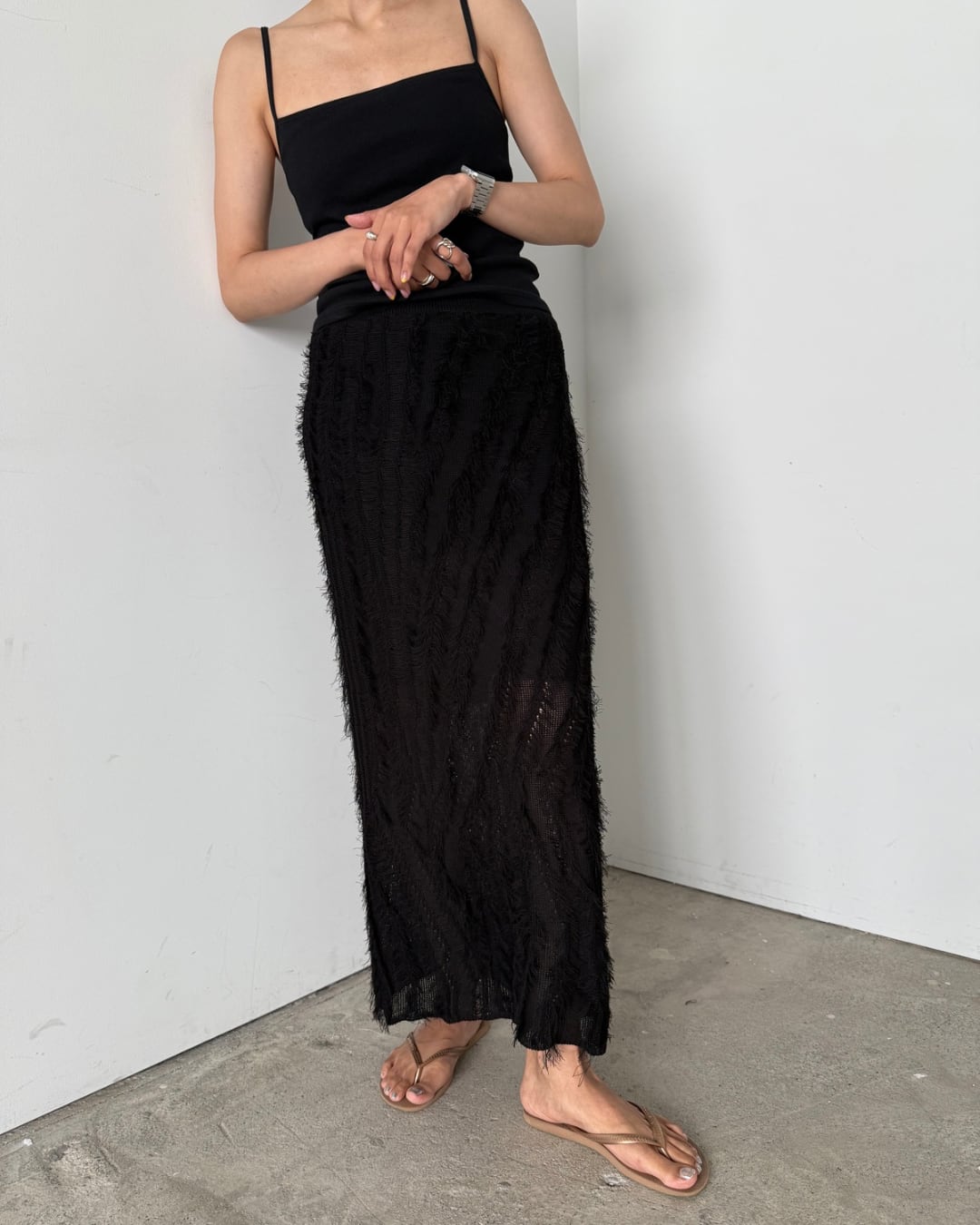 さりげない存在感とやわらかなニュアンスが魅力の、フリンジロングスカート。