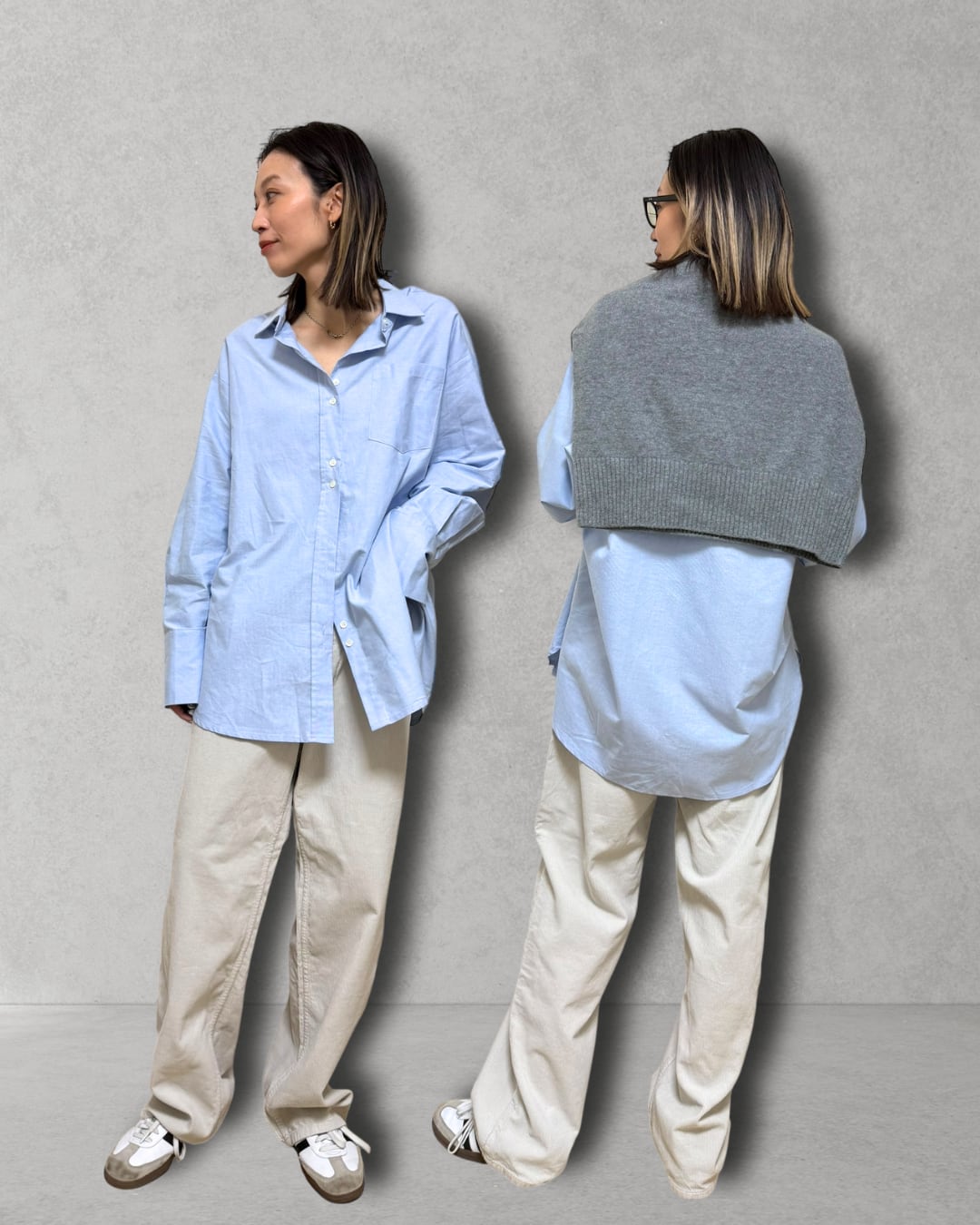 オーバーシルエットでも後ろが少し長めのデザインなので、ボタンを閉めてトップスとしても着用できて、冬には上にスウェットやニットのレイヤードも楽しめます!