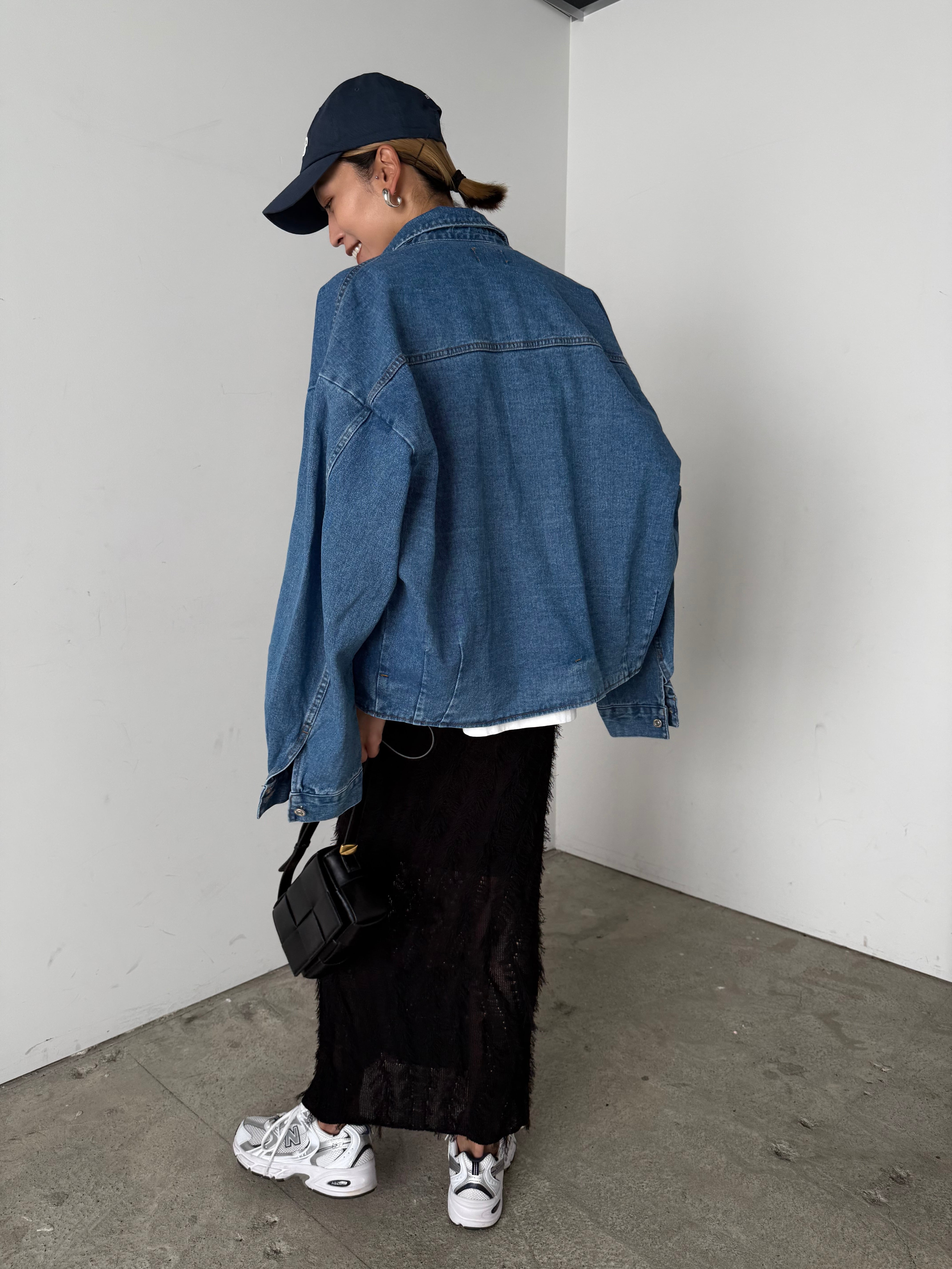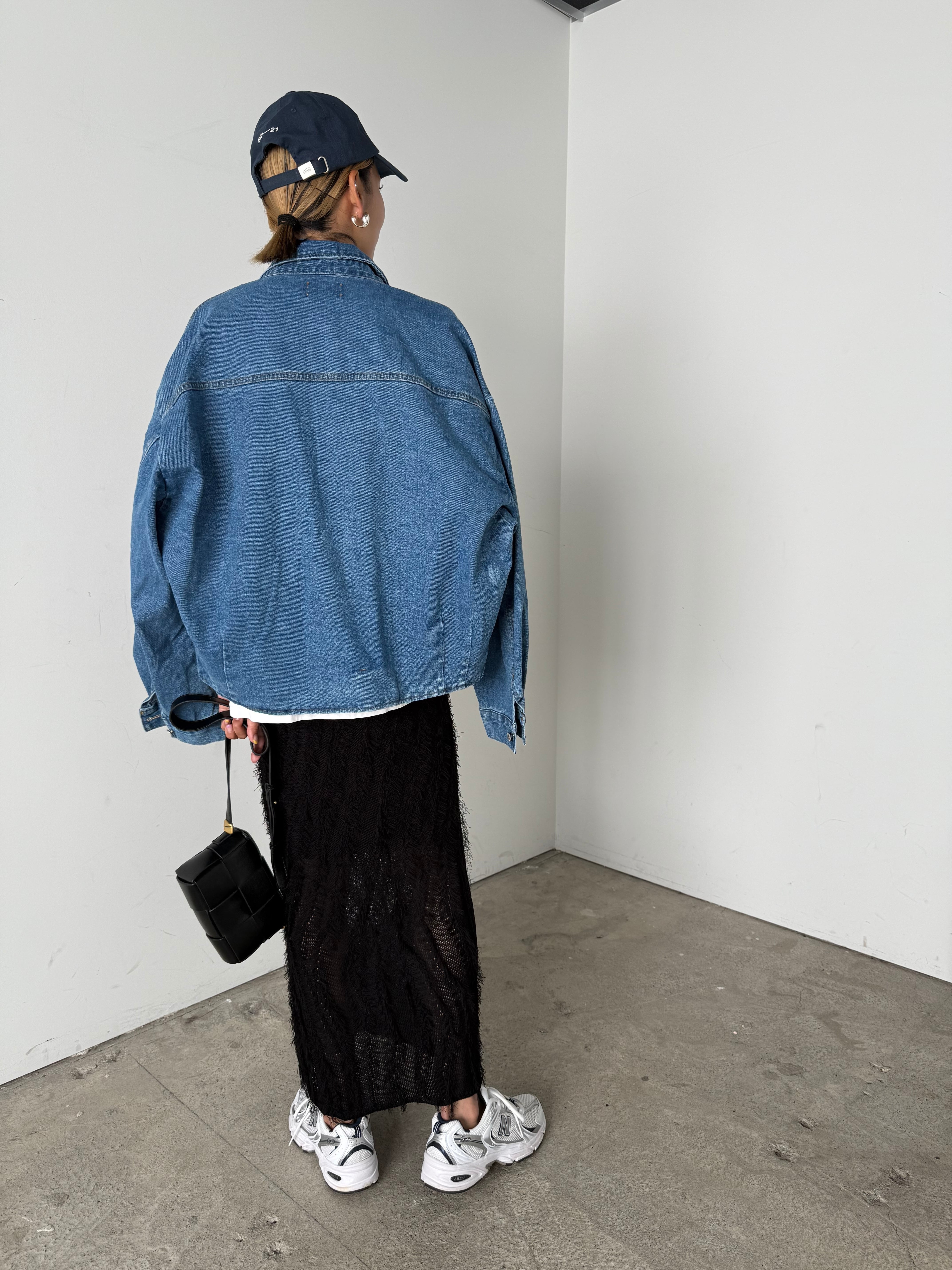 裾にタックが入っていることで立体感のあるシルエットに!ドロップショルダーのオーバーサイズジャケットになっています。コットン100%でノンストレッチデニムを使用。